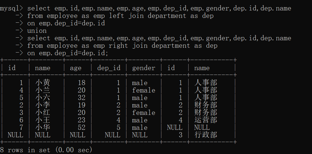 select emp.id,emp.name,emp.age,emp.dep_id,emp.gender,dep.id,dep.name from employee as emp left join department as dep on emp.dep_id=dep.id union select emp.id,emp.name,emp.age,emp.dep_id,emp.gender,dep.id,dep.name from employee as emp right join department as dep on emp.dep_id=dep.id;