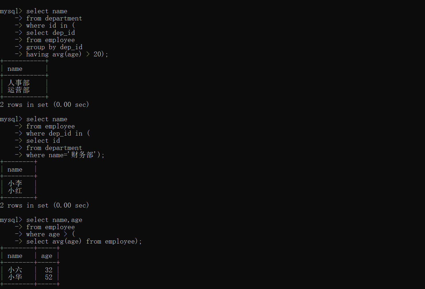 -- 查詢平均年齡在20以上的部門名稱 select name from department where id in ( select dep_id from employee group by dep_id having avg(age) > 20); -- 查詢財務(wù)部員工姓名 select name from employee where dep_id in ( select id from department where name='財務(wù)部'); -- 查詢所有大于平均年齡的員工的年齡和姓名 select name,age from employee where age > ( select avg(age) from employee);