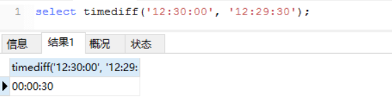 select timediff('2019-06-03 12:30:00', '2019-06-03 12:29:30');