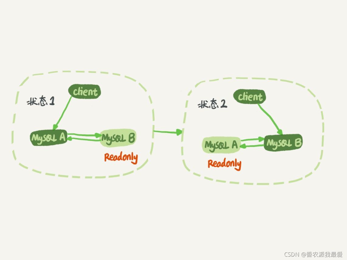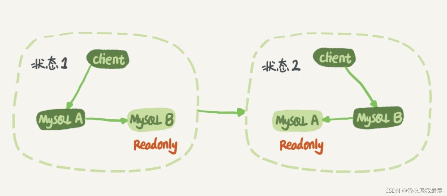 當(dāng)需要切換的時候,就切成狀態(tài) 2。這時候客戶端讀寫訪問的都是節(jié)點 B,而節(jié)點 A 是 B 的備庫。