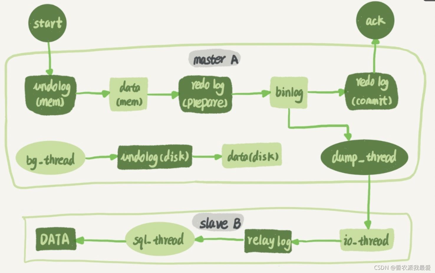 - 在備庫 B 上執(zhí)行 start slave 命令,這時候備庫會啟動兩個線程,就是圖中的 io_thread 和 sql_thread。其中 io_thread 負責(zé)與主庫建立連接。
