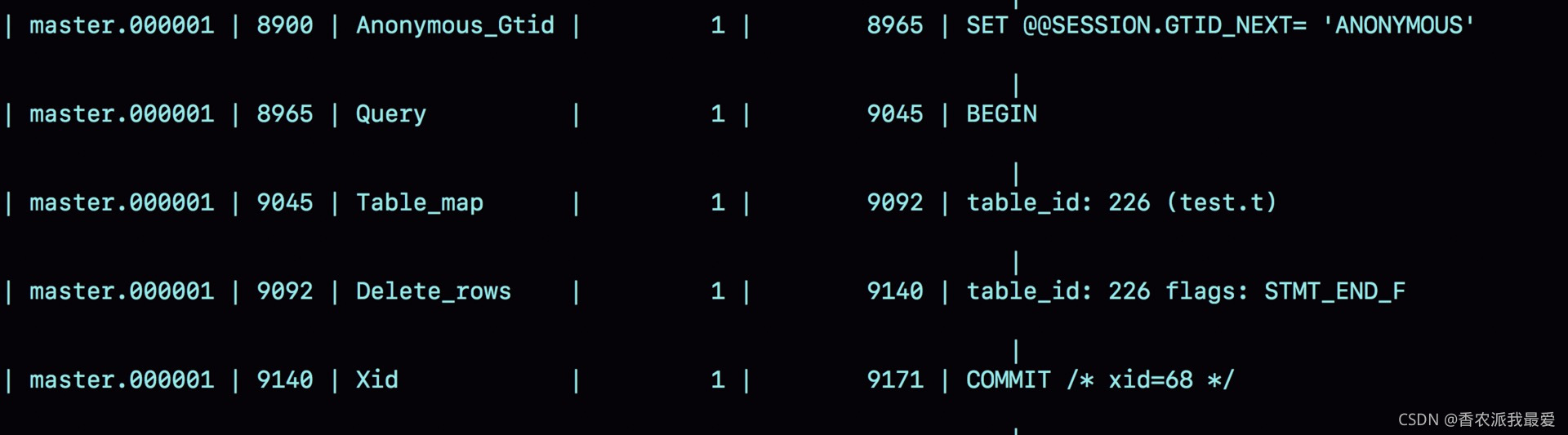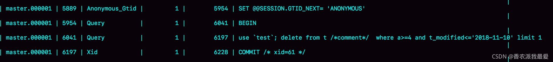 - 第一行 SET @@SESSION.GTID_NEXT='ANONYMOUS'你可以先忽略,后面文章我們會在介紹主備切換的時候再提到;