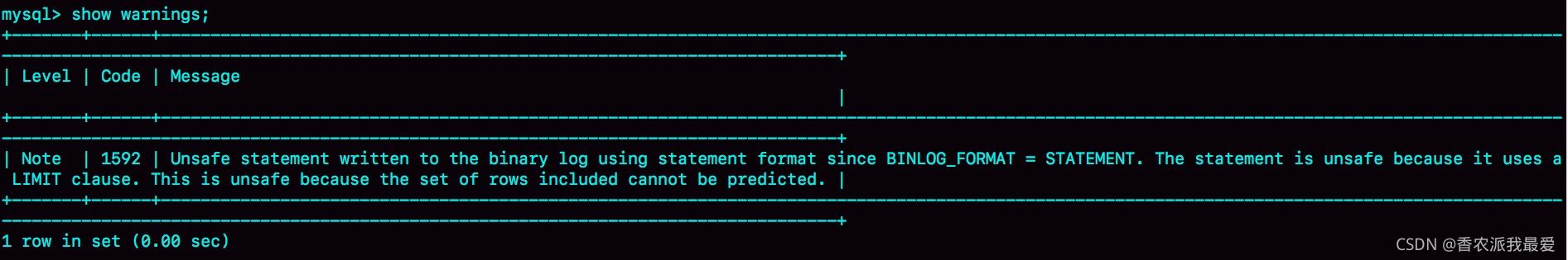運行這條 delete 命令產(chǎn)生了一個 warning,原因是當(dāng)前 binlog 設(shè)置的是 statement 格式,并且語句中有 limit,所以這個命令可能是 unsafe 的。為什么這么說呢?這是因為 delete 帶 limit,很可能會出現(xiàn)主備數(shù)據(jù)不一致的情況。