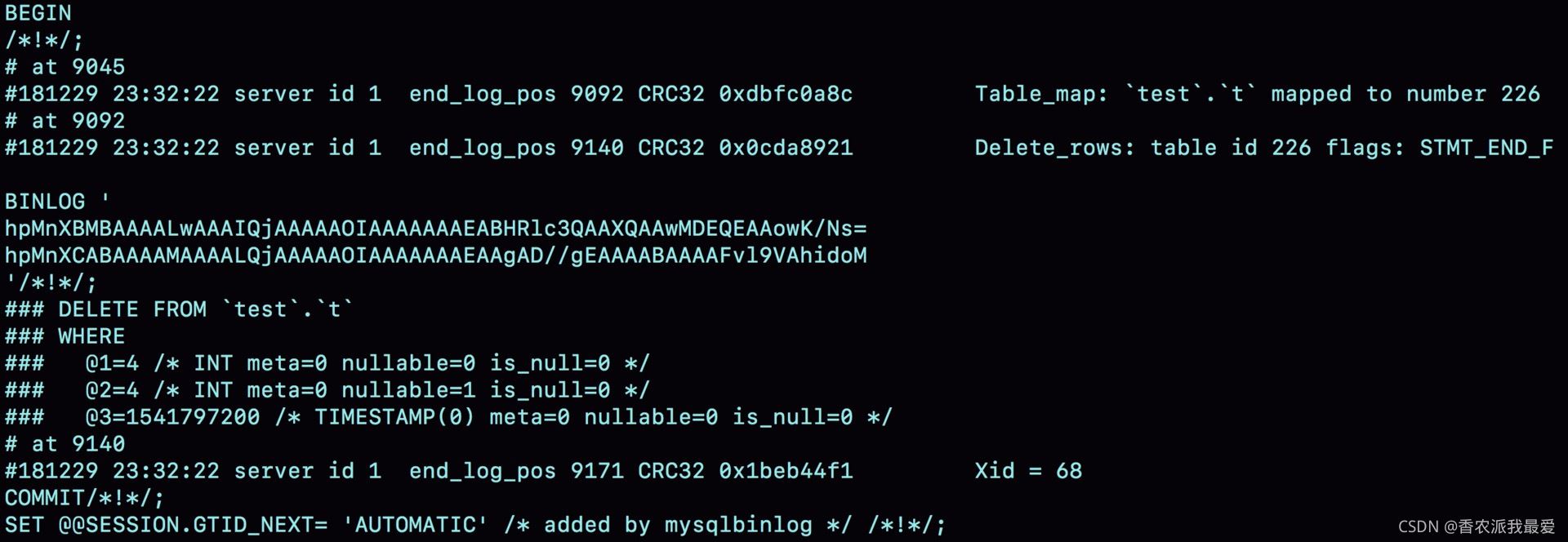 - use 'test'命令之后的 delete 語句,就是我們輸入的 SQL 原文了。可以看到,binlog“忠實”地記錄了 SQL 命令,甚至連注釋也一并記錄了。
