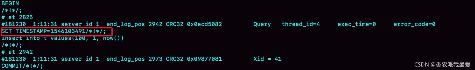 原來 binlog 在記錄 event 的時候,多記了一條命令:SET TIMESTAMP=1546103491。它用 SET TIMESTAMP 命令約定了接下來的 now() 函數(shù)的返回時間。通過這條 SET TIMESTAMP 命令,MySQL 就確保了主備數(shù)據(jù)的一致性。