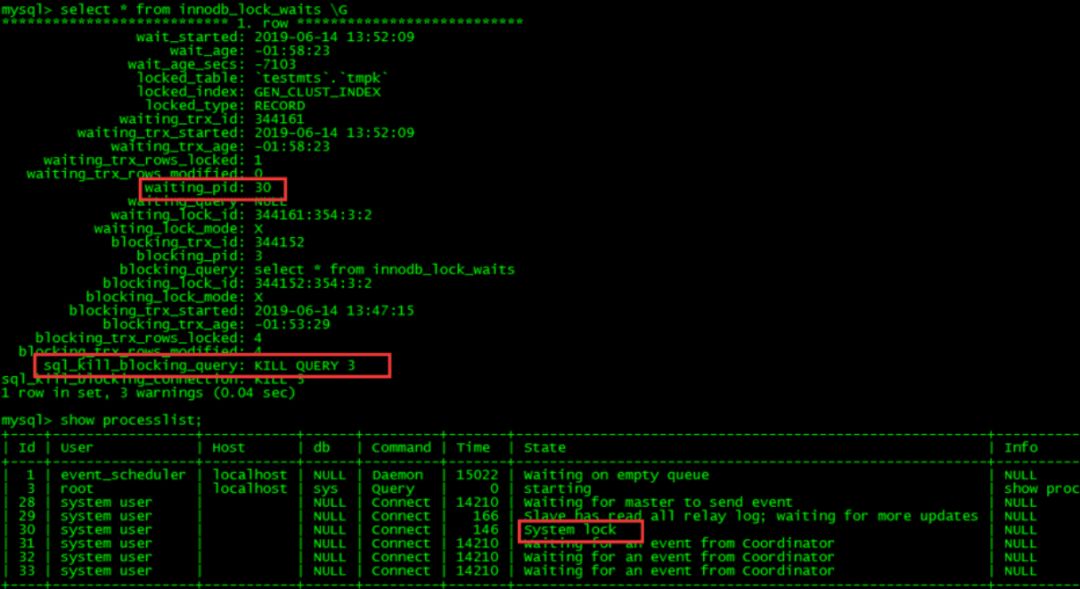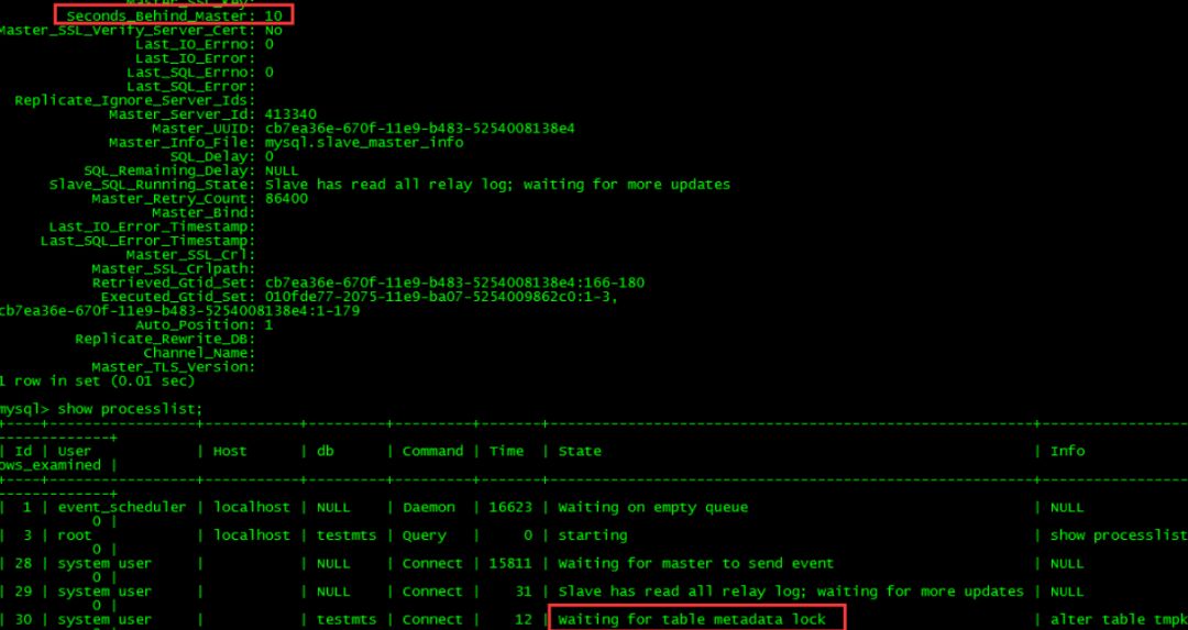 這種情況也非常容易測試,我們只需要開啟一個(gè)事務(wù)做一個(gè)select,然后主庫對同樣的表做DDL就可以出現(xiàn)如下:
