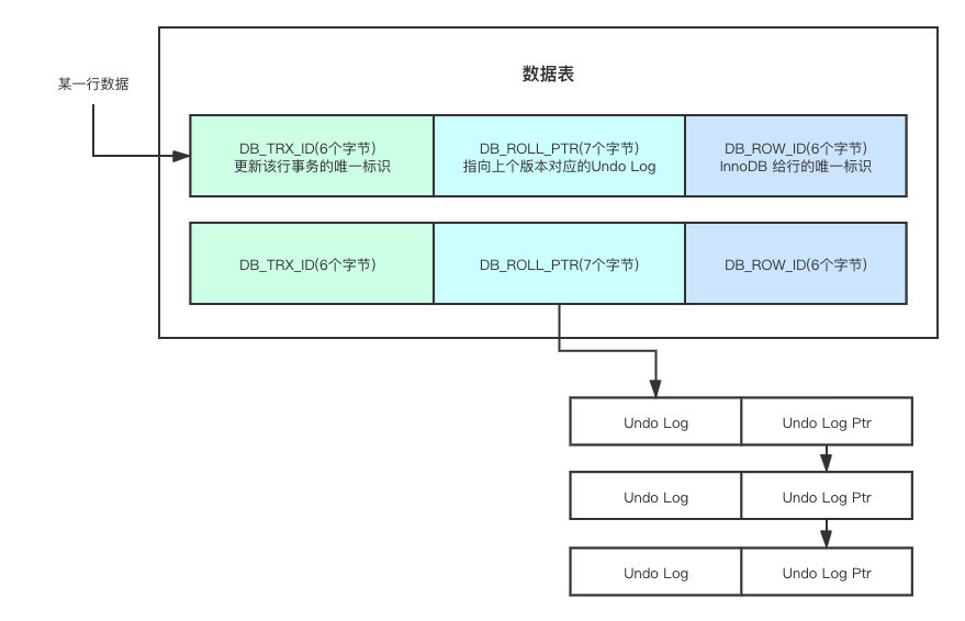 - DB_ROLL_PTR 該字段有7個字節(jié),你可以叫它回滾指針,該指針指向了存儲在回滾段中的一條具體的Undo Log。即使當(dāng)前這行數(shù)據(jù)被更新了,我們同樣的可以通過回滾指針,拿到更新之前的歷史版本數(shù)據(jù)。