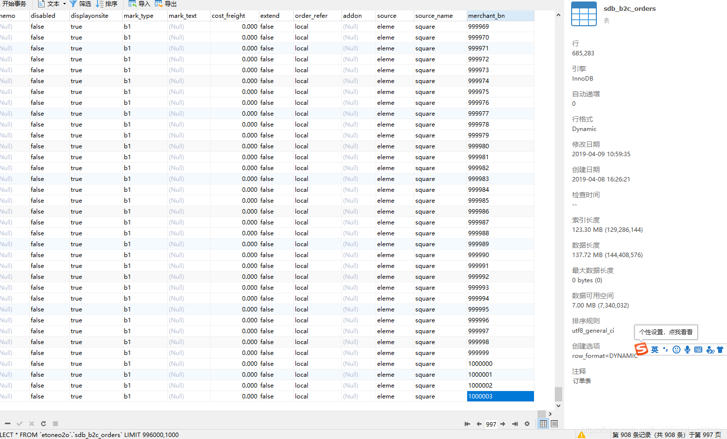 #插入30萬條數(shù)據(jù)分幾次插入 CALL insert_sdb_b2c_orders(700003,300000);