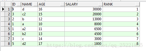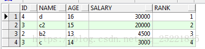 select id,name,age,salary,row_number()over(order by salary desc) rank from TEST_ROW_NUMBER_OVER t where age between '13' and '16'