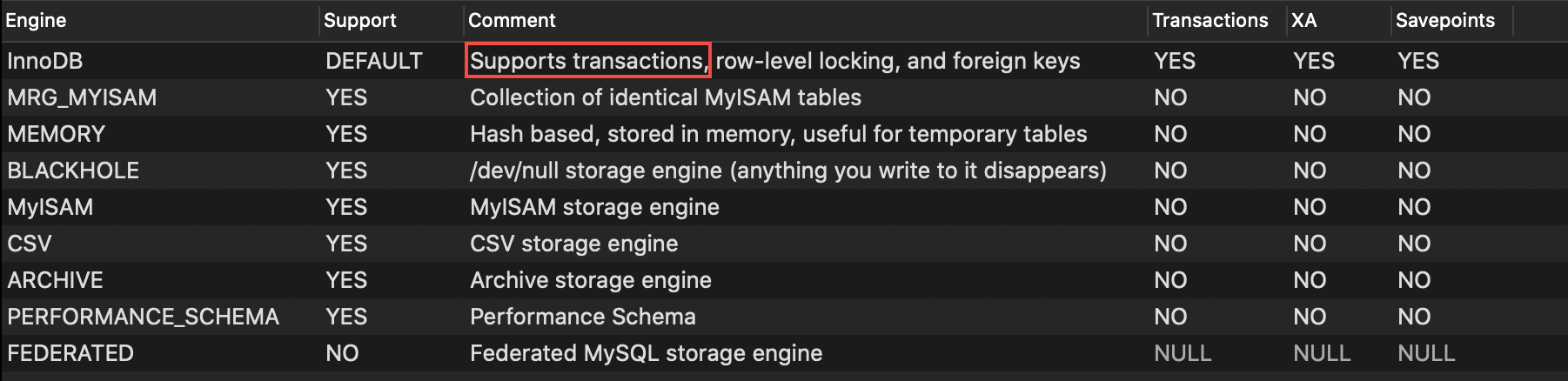 MySQL 5.5 之后,默認(rèn)的存儲引擎從 MyLSAM 替換成了 InnoDB,這其中的一個重要原因就是因為 InnoDB 支持事務(wù),我們用 SHOW ENGINES 來看一下 MySQL 中對各種存儲引擎的描述。