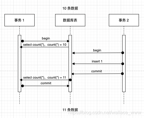 - 事務(wù) 1 再次讀取數(shù)量,得到 11 條數(shù)據(jù),對事務(wù) 1 而言莫名其妙的多了一條,好像產(chǎn)生幻覺了一樣,發(fā)生幻讀