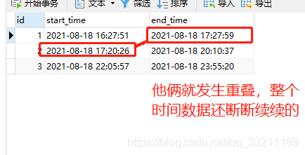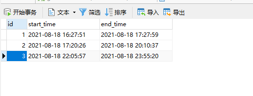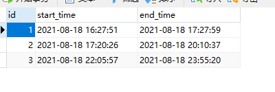 CREATE TABLE test01 ( id int(32) unsigned NOT NULL AUTO_INCREMENT, start_time datetime NOT NULL, end_time datetime NOT NULL, PRIMARY KEY (`id`) ) INSERT INTO test01(id, start_time, end_time) VALUES (1, '2021-08-18 16:27:51', '2021-08-18 17:27:59'); INSERT INTO test01(id, start_time, end_time) VALUES (2, '2021-08-18 17:20:26', '2021-08-18 20:10:37'); INSERT INTO test01(id, start_time, end_time) VALUES (3, '2021-08-18 22:05:57', '2021-08-18 23:55:20');