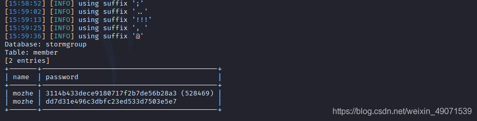 3.可以看到存在注入漏洞,掃到了5個數(shù)據(jù)庫。要獲取管理員用戶密碼,我們可以先從stormgroup注入。查看stormgroup這個數(shù)據(jù)庫存在的表單
