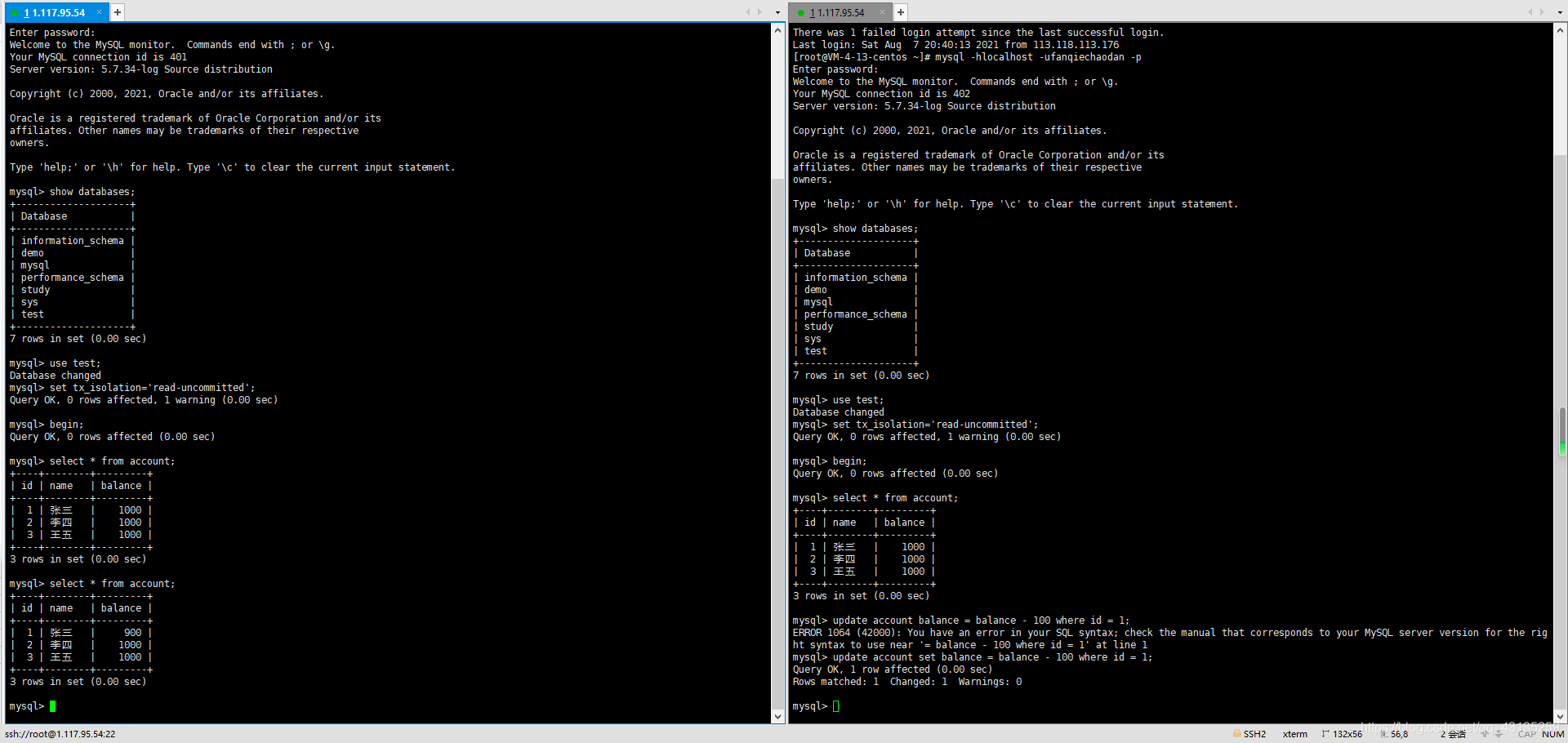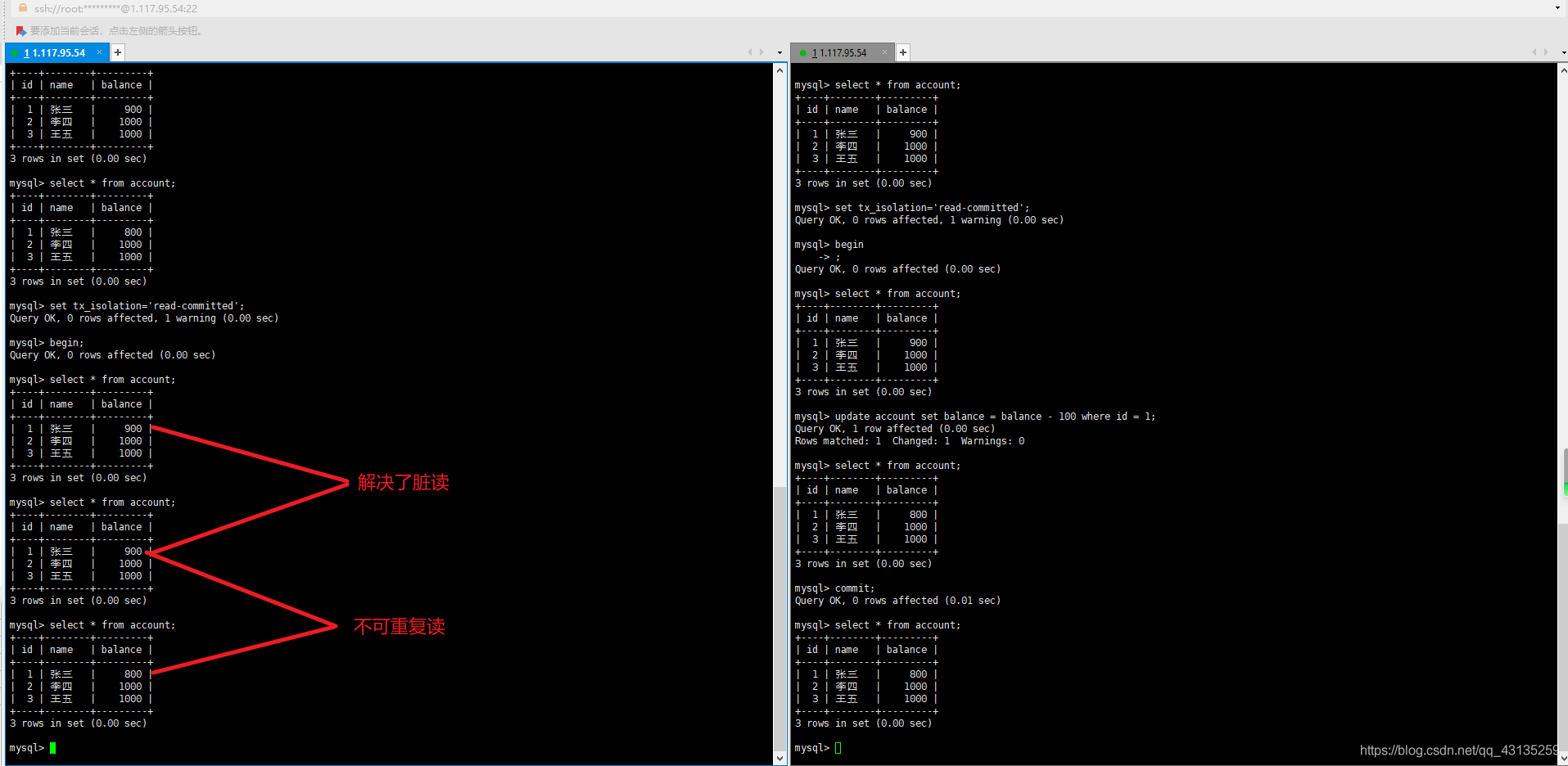 2.1 設(shè)置隔離級別讀已提交:set tx_isolation=‘read-committed';