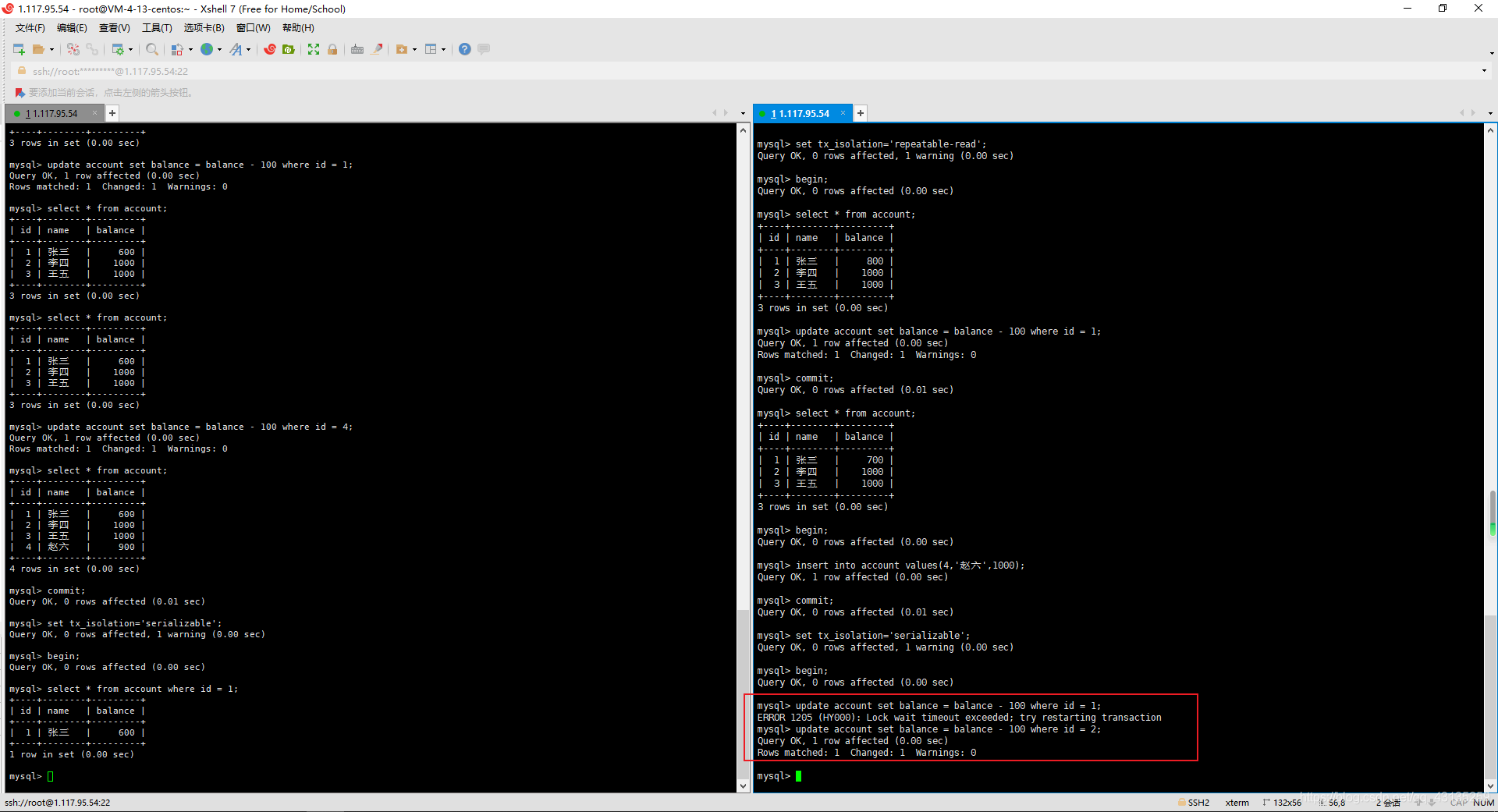 4.1 設(shè)置隔離級別串行化:set tx_isolation=‘serializable';