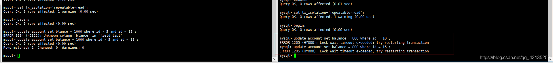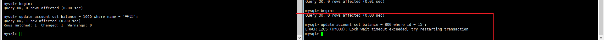 3.3 在客戶端A未提交的時候,客戶端B執(zhí)行update account set balance = 800 where id = 15 ;同樣會被阻塞至客戶端A提交或者超時;