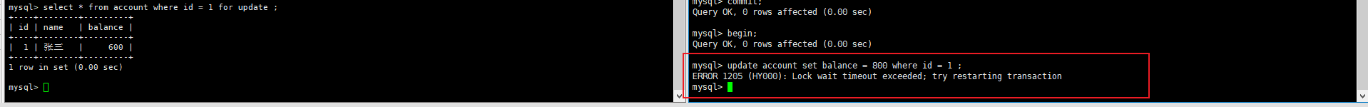 4.3 在客戶端A未提交的時候,客戶端B執(zhí)行update account set balance = 800 where id = 1 ;會被阻塞至客戶端A提交或者超時;