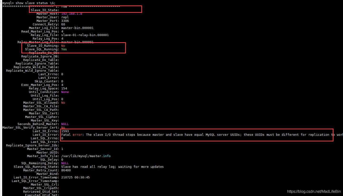 從機(jī)查看主從同步狀態(tài)show slave status \G; 時報錯