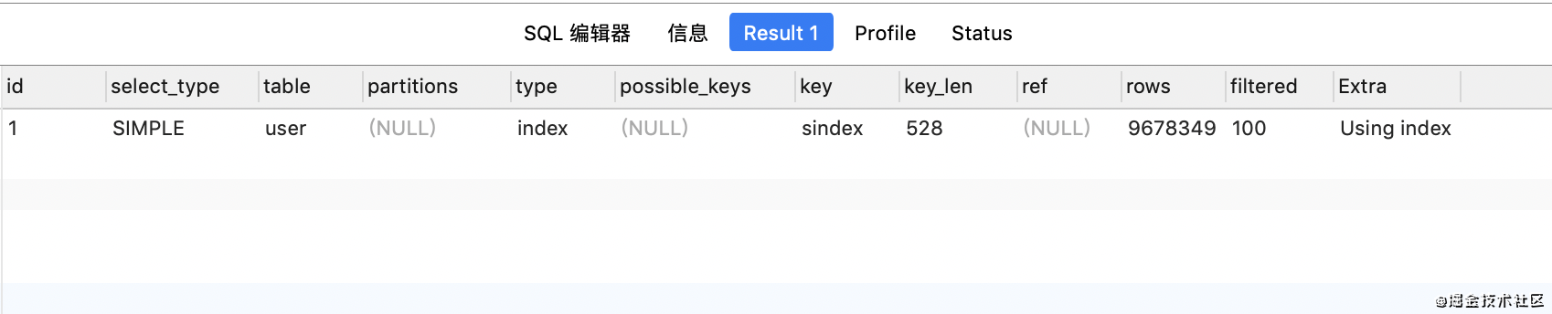 看上面的執(zhí)行計(jì)劃,雖然type是從all->index,走了sindex索引,但是實(shí)際上查詢速度并沒有發(fā)生改變。