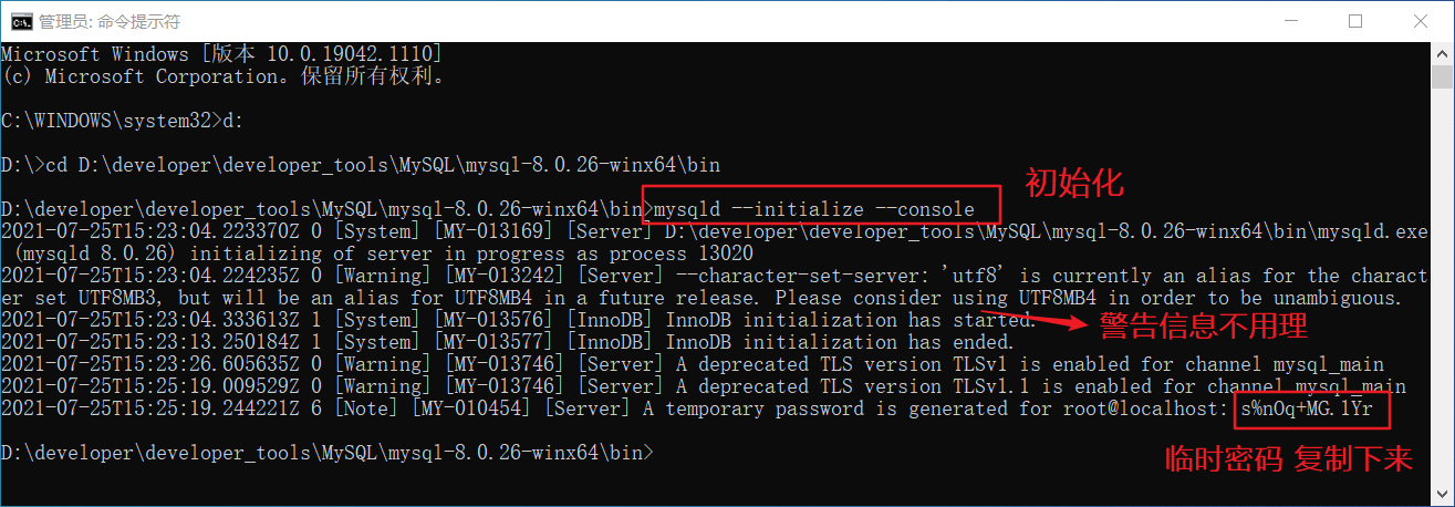 管理員CMD進(jìn)入解壓后的bin目錄,輸入mysqld --initialize --console