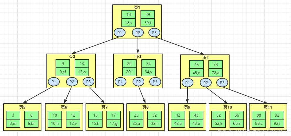 如下圖的3階B樹中,查找id=42的數(shù)據(jù)。首先在第一頁里判斷42鍵值大于39,根據(jù)指針P3找到第4頁,再進(jìn)行比較,小于鍵值45,又根據(jù)指針P1找到第9頁,發(fā)現(xiàn)匹配有匹配的鍵值42,即找到相應(yīng)數(shù)據(jù)。