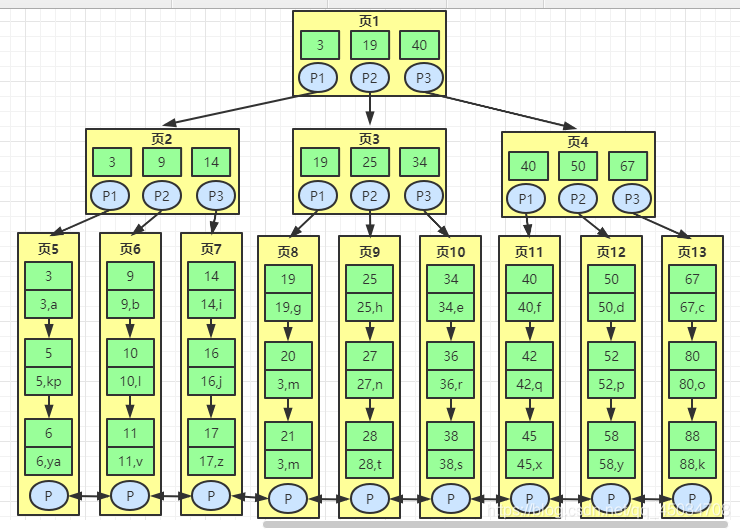 比如查詢id>=19并且id<30的數(shù)據(jù):通常根節(jié)點(diǎn)常駐在內(nèi)存中(即頁1已在內(nèi)存),首先在頁1找到了鍵值19及其對(duì)應(yīng)指針P2,通過P2讀頁3(此時(shí)頁3不在內(nèi)存中,需要從磁盤中加載),然后在頁3查找鍵值19的指針P1,又定位到頁8(同樣的從磁盤加載到內(nèi)存),因?yàn)閿?shù)據(jù)是按鏈表進(jìn)行順序鏈接的,可以通過二分找到鍵值19對(duì)應(yīng)數(shù)據(jù)。