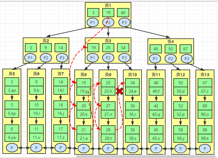 找到鍵值19后,因?yàn)槭欠秶檎?,這時(shí)可以在葉子節(jié)點(diǎn)里進(jìn)行鏈表的查詢,依次遍歷并匹配滿足的條件,一直找到鍵值21,到最后一個(gè)數(shù)據(jù)仍不能滿足我們的要求,此時(shí)會(huì)拿著頁8的指針P去讀取頁9的數(shù)據(jù),頁9不在內(nèi)存中同樣需要磁盤加載讀進(jìn)內(nèi)存,然后依此類推,直到匹配到鍵值34時(shí)不滿足條件則終止,這就是通過聚集索引查找數(shù)據(jù)的一種方法。