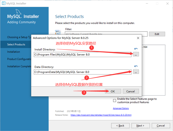 點(diǎn)擊next后,我們繼續(xù)配置MySQL的安裝路徑以及它的數(shù)據(jù)存放路徑,請嚴(yán)格按照1,2,3,4,5,6,7操作點(diǎn)擊相應(yīng)的位置。