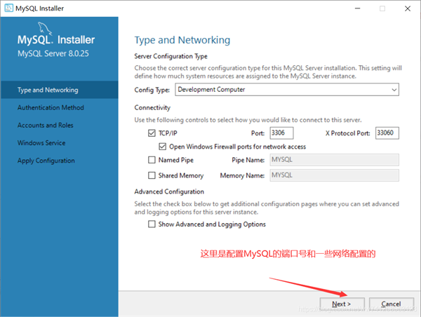 這里是配置MySQL的端口號和網(wǎng)絡(luò)配置的,我們直接選擇默認(rèn)的就好了,點(diǎn)擊Next,如有需要請參照:這里