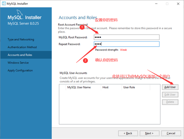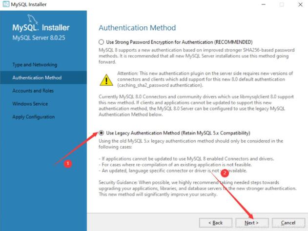 這里是選擇密碼的一個設(shè)置方式,如果選擇第一個那么就會使用MySQL8.X的一個密碼設(shè)方式進(jìn)行設(shè)置密碼,選擇第二個就可以使用MySQL5.X的方式設(shè)置密碼,我們選擇第二個。