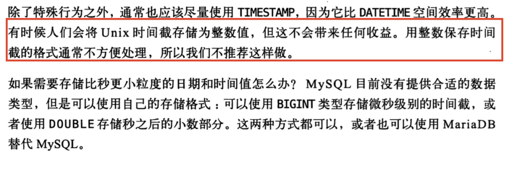 TIMESTAMP 與 INT 本質(zhì)一樣,但是相比而言雖然 INT 對開發(fā)友好,但是對 DBA 以及數(shù)據(jù)分析人員不友好,可讀性差。所以《高性能 MySQL 》的作者推薦 TIMESTAMP 的原因就是它的數(shù)值表示時(shí)間更加直觀。下面是原文: