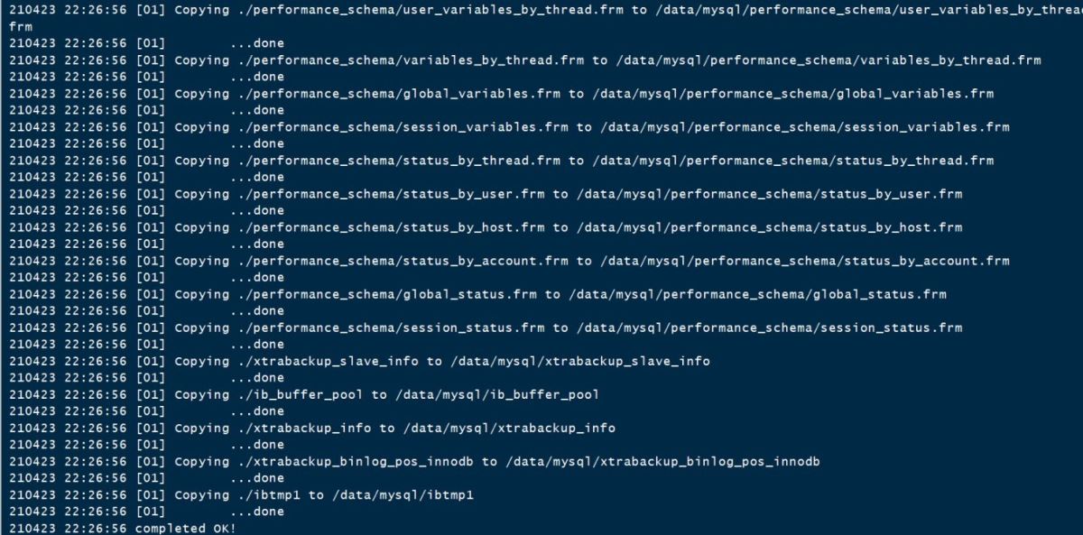 管控服務(wù)需要驗(yàn)證還原是否成功,再?zèng)Q定是否需要向下操作,驗(yàn)證步驟也很簡(jiǎn)單粗暴,直接檢查備份恢復(fù)日志中是否有ERROR,并且最后一行是否為completed OK!
