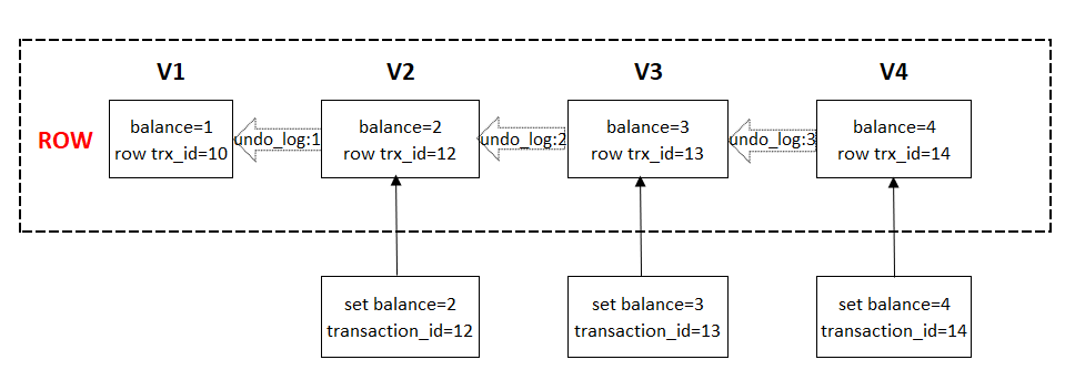 - ROW有四個版本V1-V4,即經(jīng)過三次更新balance后,當(dāng)前最新版本為V4,當(dāng)前balance已經(jīng)更新為4,是最新值