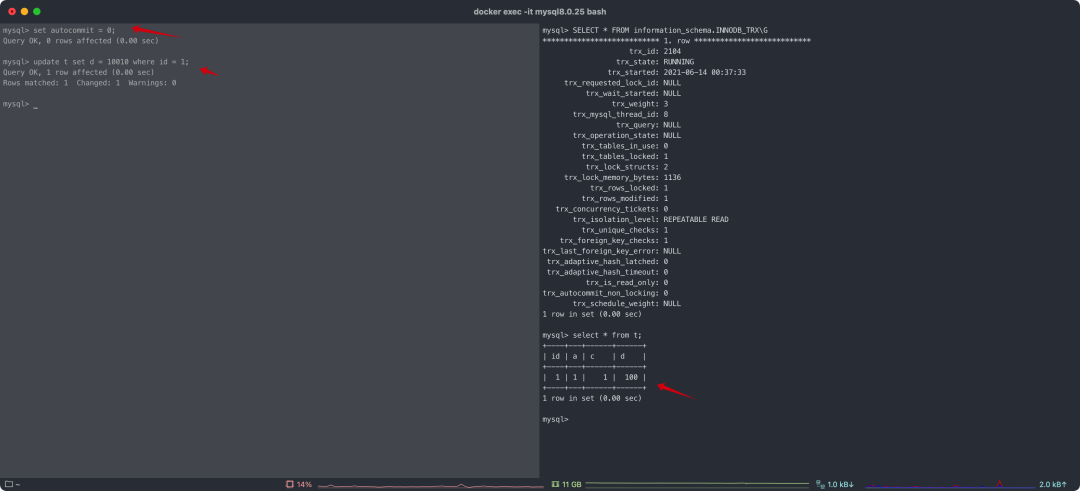 通過截圖可以看出,有一個事務在執(zhí)行,因為設置了 set autocommit = 0;,所以后面的 update 操作修改結(jié)果,其他 session 并不會查到(RR 級別)。