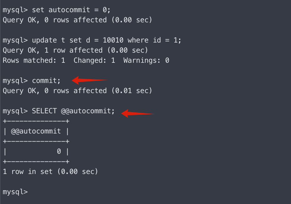 設置 autocommit 之后,本次連接的所有 sql 都是事務的形式,比如每次 commit 提交。