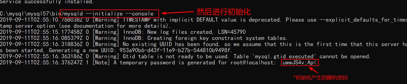 ③初始化mysql,在這里,初始化會產(chǎn)生一個隨機密碼,如下圖框框所示,記住這個密碼,后面會用到(mysqld --initialize --console)