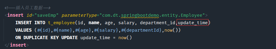 <insert id="saveEmp" parameterType="com.dt.springbootdemo.entity.Employee">