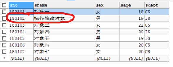 UPDATE `student` SET `sname` = '操作修改對象一' WHERE `sno`= 180102; -- 記得添加的時(shí)候不要帶逗號,我的問題出在了下面帶了逗號 -- UPDATE `student` SET `sname` = '操作修改對象一',WHERE `sno`= 180102;