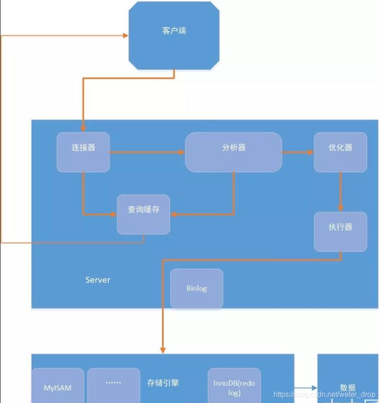 - Server 層:主要包括連接器、查詢緩存、分析器、優(yōu)化器、執(zhí)行器等,所有跨存儲引擎的功能都在這一層實現(xiàn),比如存儲過程、觸發(fā)器、視圖,函數(shù)等,還有一個通用的日志模塊 binglog 日志模塊。