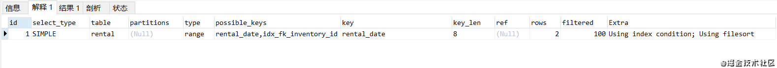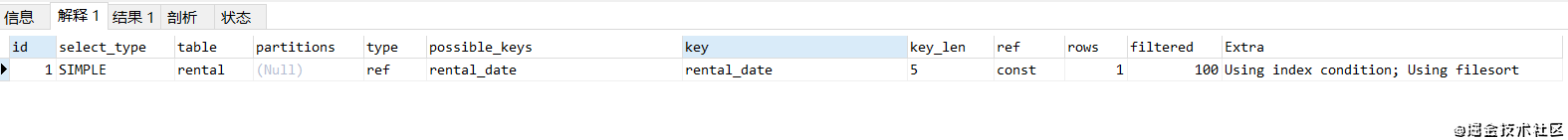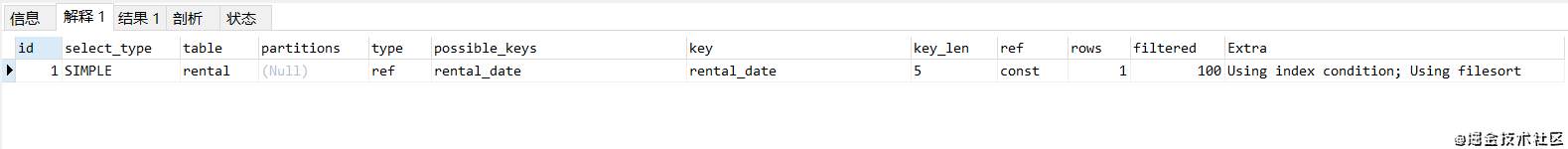 書(shū)上的Extra寫(xiě)的是Using where,而我執(zhí)行的時(shí)候是Using index condition ,原因是高性能MySQL中使用的版本是5.5,5.6版本中的索引條件推送(index condition pushdown)還處于未正式發(fā)布階段呢。這里沒(méi)有filesort的原因是因?yàn)橛袀€(gè)rental_date = '2005-05-25'的常量條件,相當(dāng)于將索引的第一列補(bǔ)足了,這樣就符合了索引的最左前綴要求。