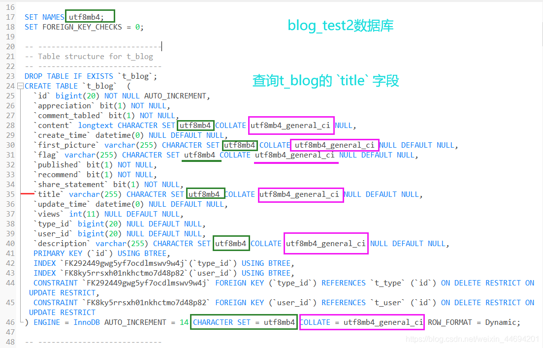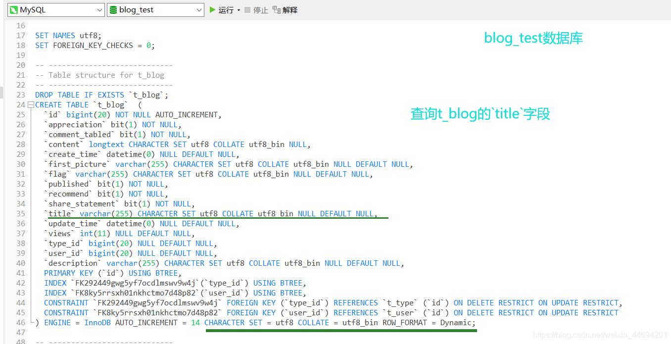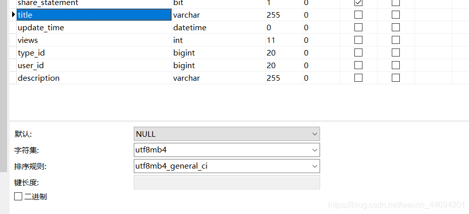 單獨(dú)指定所需字段(比如,在此處 我所需要不區(qū)分大小寫的字段為表 ‘t_blog' 中的 ‘title' 字段)為 ‘utf8mb4' 編碼格式,COLLATE 為“utf8mb4_bin”: