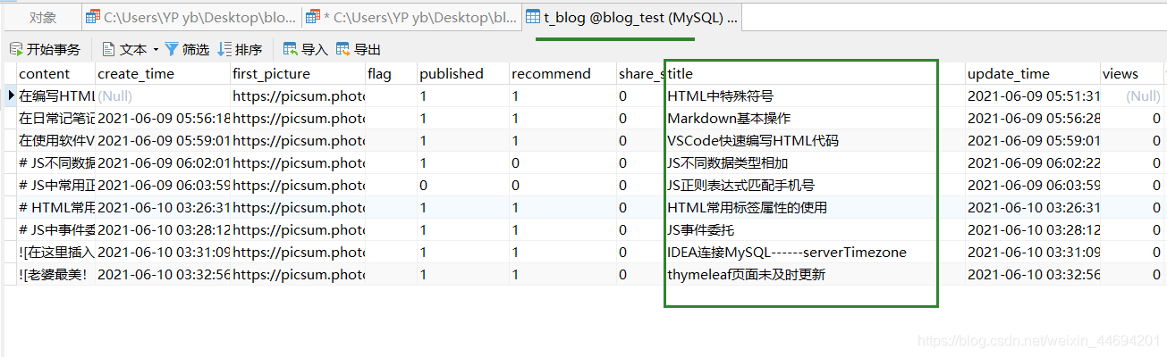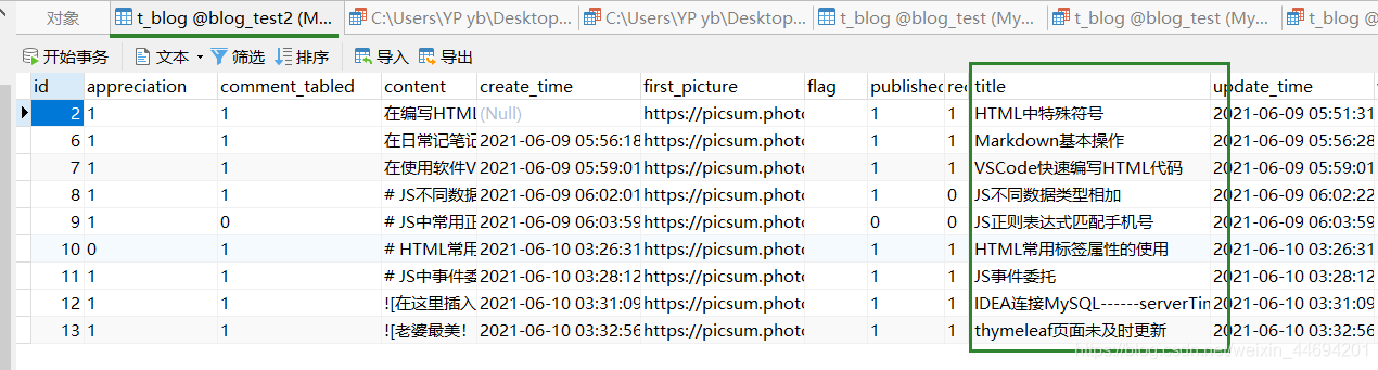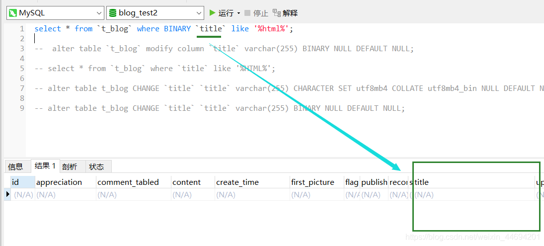 單獨(dú)指定所需字段(比如,在此處 我所需要區(qū)分大小寫的字段為表 ‘t_blog' 中的 ‘title' 字段)為 ‘utf8' 編碼格式,COLLATE 為“utf8_bin”;