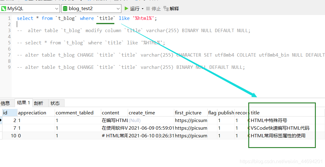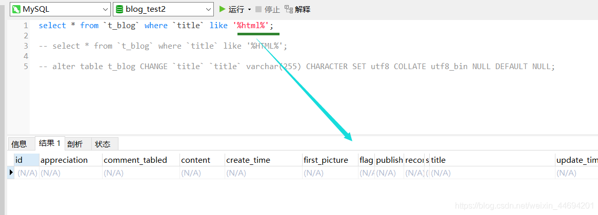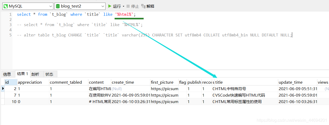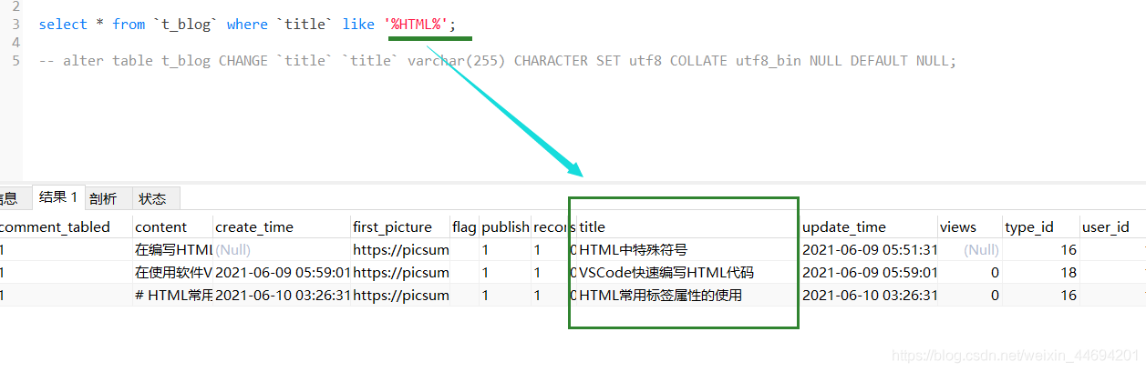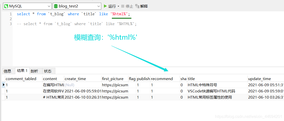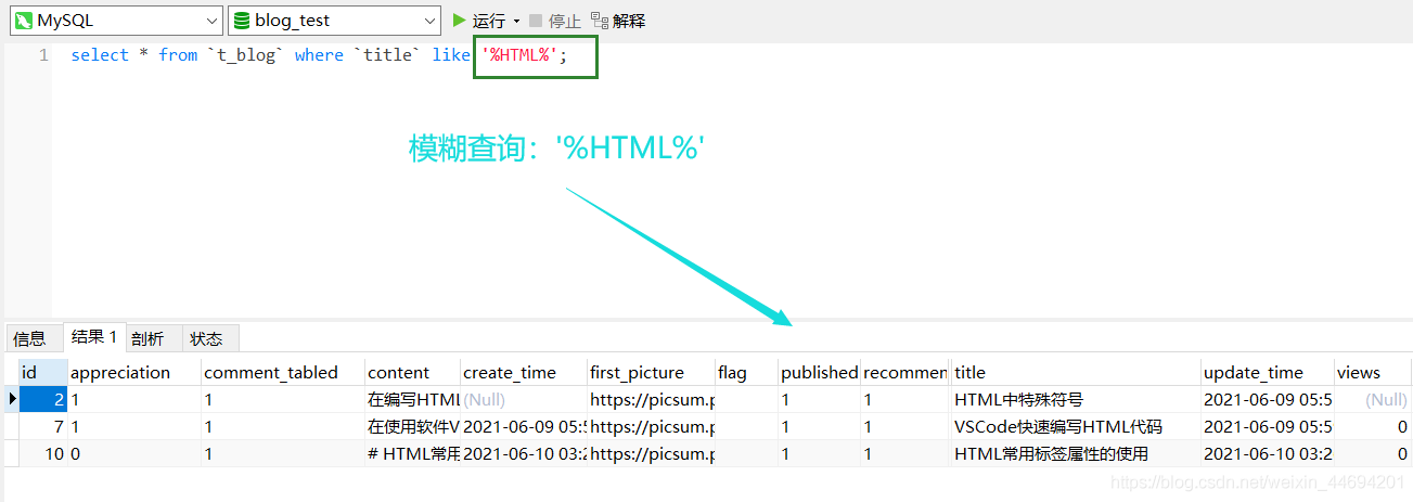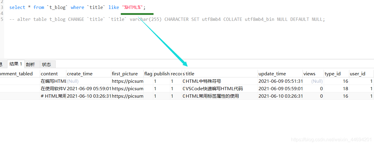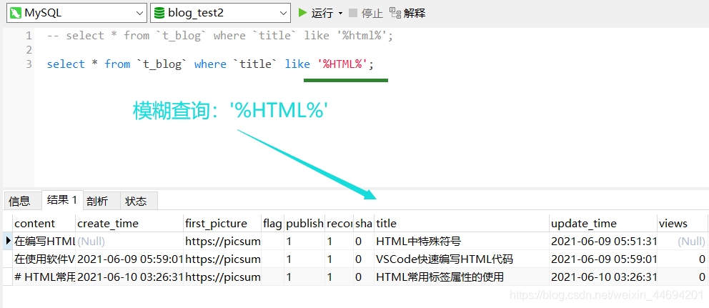 查詢結(jié)果 select * from t_blog where title like ‘%html%';
