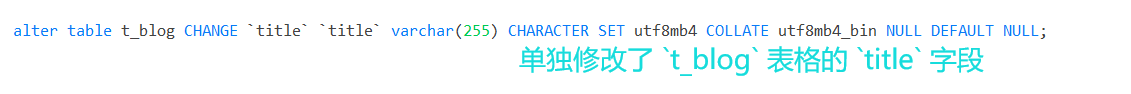 alter table t_blog CHANGE `title` `title` varchar(255) CHARACTER SET utf8 COLLATE utf8_bin NULL DEFAULT NULL;