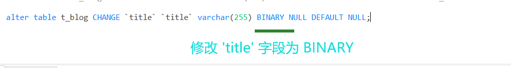 alter table t_blog CHANGE `title` `title` varchar(255) BINARY NULL DEFAULT NULL;