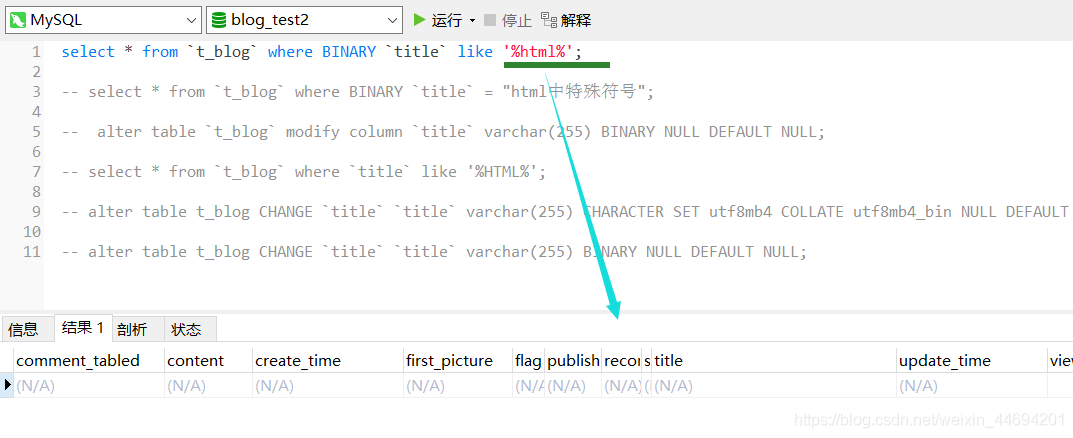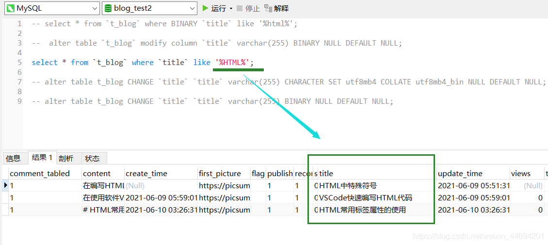 select * from `t_blog` where BINARY `title` like '%html%';