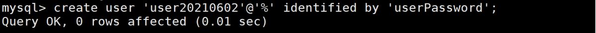 create user 'userName'@'%' identified by 'yourPassword'; # 'userName'@'%' @后面的'%'是host的配置