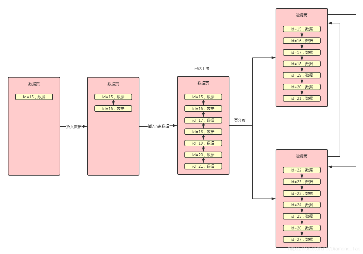 從上述的數(shù)據(jù)頁結(jié)構(gòu)可知,每次進行數(shù)據(jù)插入時User Records區(qū)域就會變大,相應(yīng)的的User Record區(qū)域就會減少。當User Record區(qū)域消耗完之后,就會發(fā)生頁分裂,形成新的數(shù)據(jù)頁。這里需要注意的是,如果我們使用的是Mysql中的自增主鍵,那么可以保證按照id的增長順序進行數(shù)據(jù)行排列,但是如果主鍵是我們自己設(shè)置的并不是自增長的,那么有可能出現(xiàn)后面插入的數(shù)據(jù)的主鍵值小于前面數(shù)據(jù)的主鍵值,那么在進行頁分裂的時候,Mysql會按照主鍵大小重新進行排列。此處不知道大家有沒有疑問,為什么一定要按照主鍵大小進行排列呢?實際上和后續(xù)的數(shù)據(jù)查詢有關(guān)系,數(shù)據(jù)頁中的數(shù)據(jù)按照主鍵順序進行排列是索引可以正常運行的基礎(chǔ)。大致的過程如下圖所示: