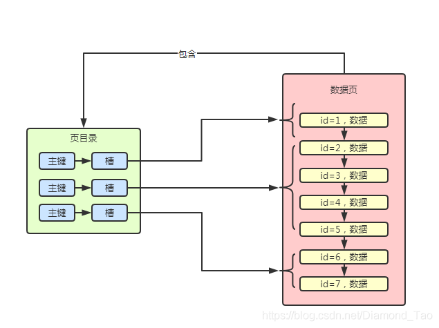 每個數(shù)據(jù)頁都有自己的頁目錄上面頁結(jié)構(gòu)中的Page Directory,這個頁目錄的作用實際上就是用來進行數(shù)據(jù)行定位的。數(shù)據(jù)頁中的數(shù)據(jù)實際上是按組分配的,頁目錄中的不同的槽位,其實是對應(yīng)了數(shù)據(jù)頁中的不同的分組,查詢數(shù)據(jù)時,通過id找到對應(yīng)的槽,再根據(jù)對應(yīng)的槽來知道對應(yīng)在數(shù)據(jù)頁中的數(shù)據(jù)行分組,遍歷數(shù)據(jù)行分組中的數(shù)據(jù)直到找到對應(yīng)的數(shù)據(jù)。