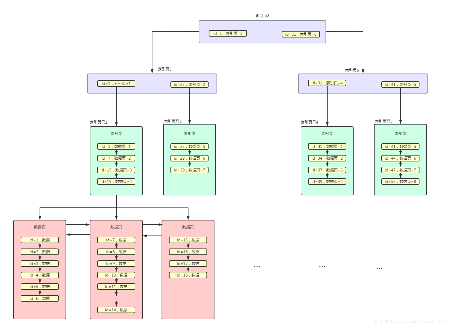 Mysql實際是將索引說句存儲在索引頁中的,當數(shù)據(jù)量比較大時候,對應(yīng)的索引也會比較多,因此通過專門的索引頁來存儲索引數(shù)據(jù)。另外在這些索引頁的上層又通過主鍵與索引頁號來繼續(xù)進行索引頁的查詢定位,因此我們得到如下的結(jié)構(gòu)。其中的id號指的是對應(yīng)最小的id號。